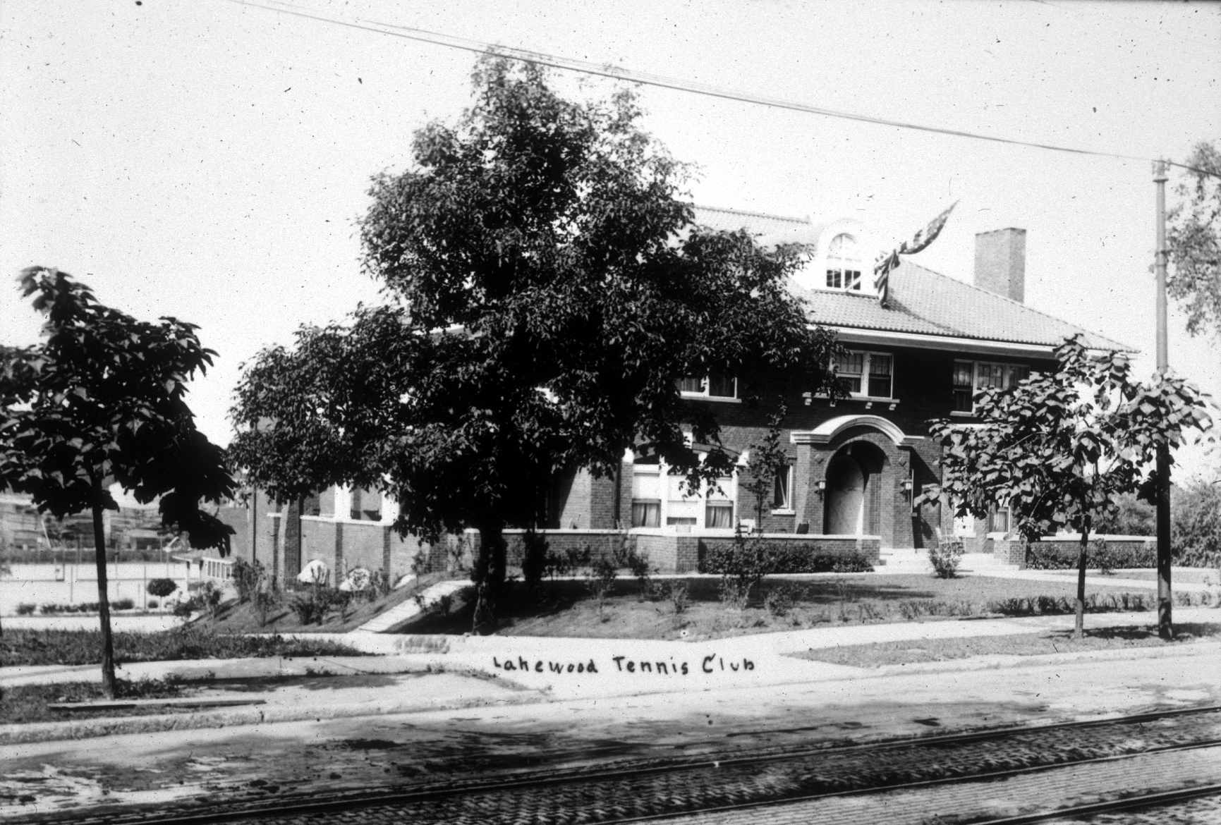 The Lakewood Tennis Club, built in 1913, became an Elks lodge in 1918. In this photo, the building is still a tennis club, and its courts can be seen behind the building on the left. In the foreground are streetcar tracks running along Detroit Avenue. This building is now home to a restaurant and bar. | Date: ca. 1915 | Source: Lakewood Historical SocietyDownload Original File