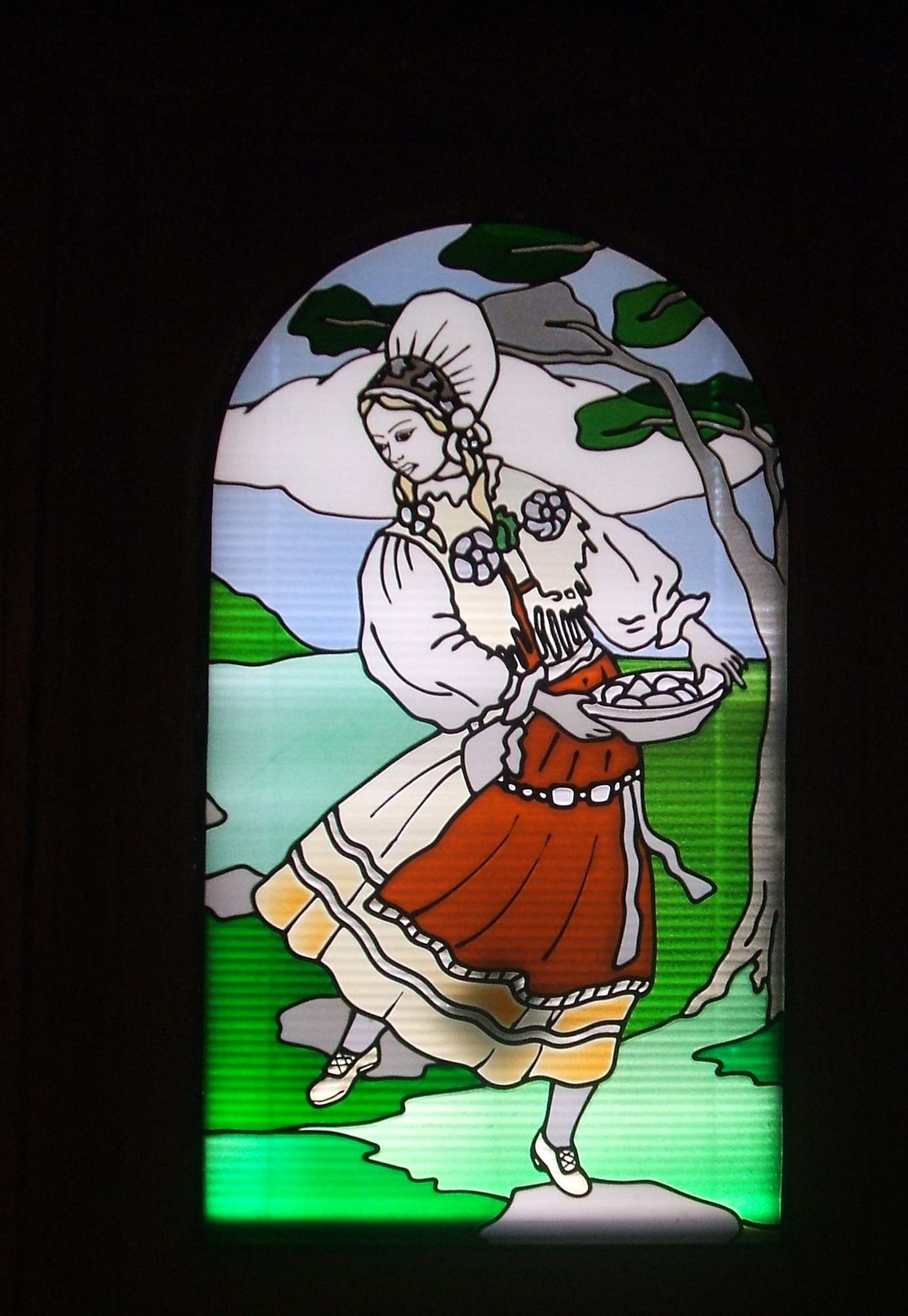 Stained Glass ID: 2210 | This file appears in: Frank Sterle's Slovenian Country House A stained glass window featuring a woman in traditional Slovenian garb is built into one of the walls at Sterle's Slovenian Country House. Download Original File "Stained Glass" appears in: Frank Sterle's Slovenian Country House