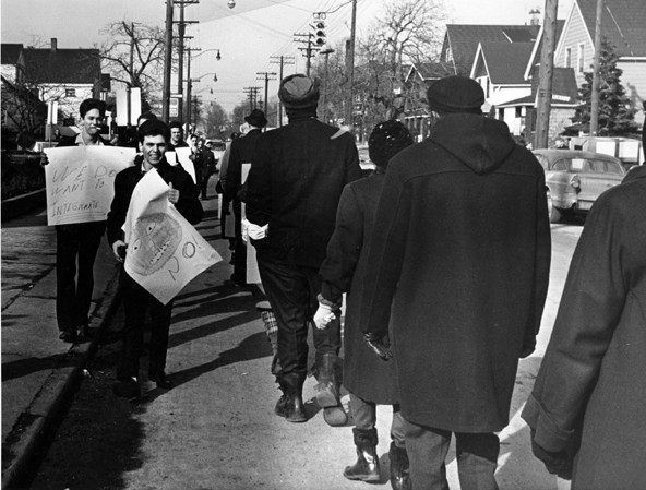 Picketers protest against the integration of African-American schoolchildren into white schools in front of Little Italy's Memorial Elementary on January 30, 1964. Tensions were especially high in Little Italy, and this protest eventually turned violent as African-Americans were attacked in the street.