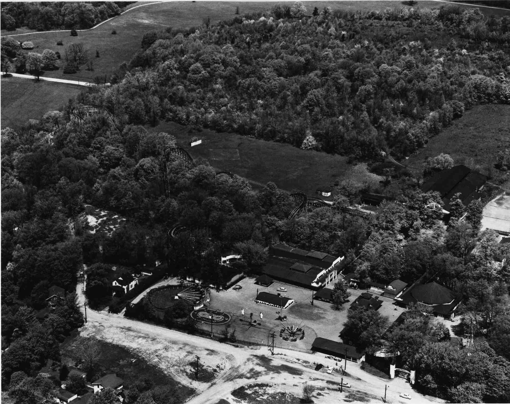 Aerial View ID: 2261 | This file appears in: Puritas Springs Park The aerial view of Puritas Springs shows the layout of the 75 acre park. Note the rollercoaster that enters the wooded areas. | Source: Western Reserve Historical Society Download Original File SourceWestern Reserve Historical Society "Aerial View" appears in: Puritas Springs Park