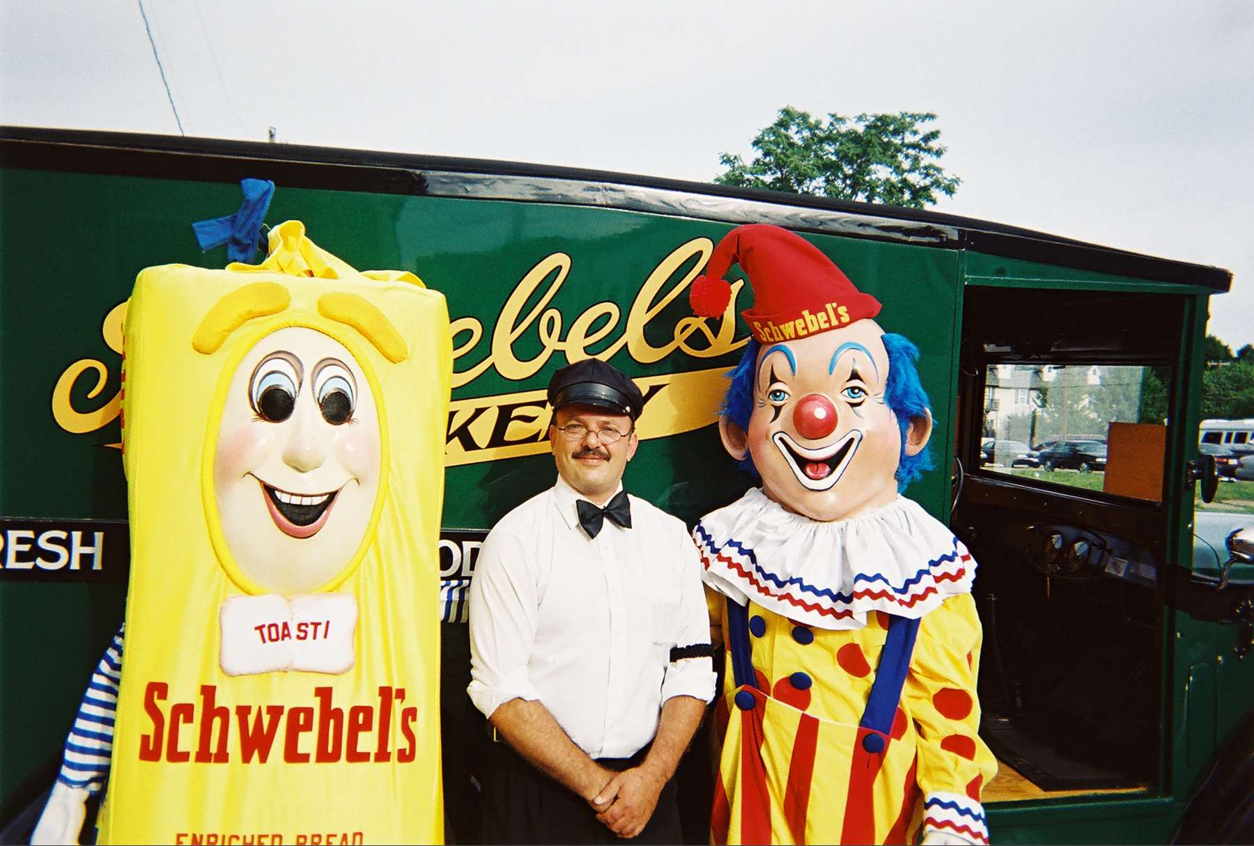 Schwebel's Mascots Happy the Clown and Toasti stand with a Schwebel's driver in front of one of the original delivery trucks.