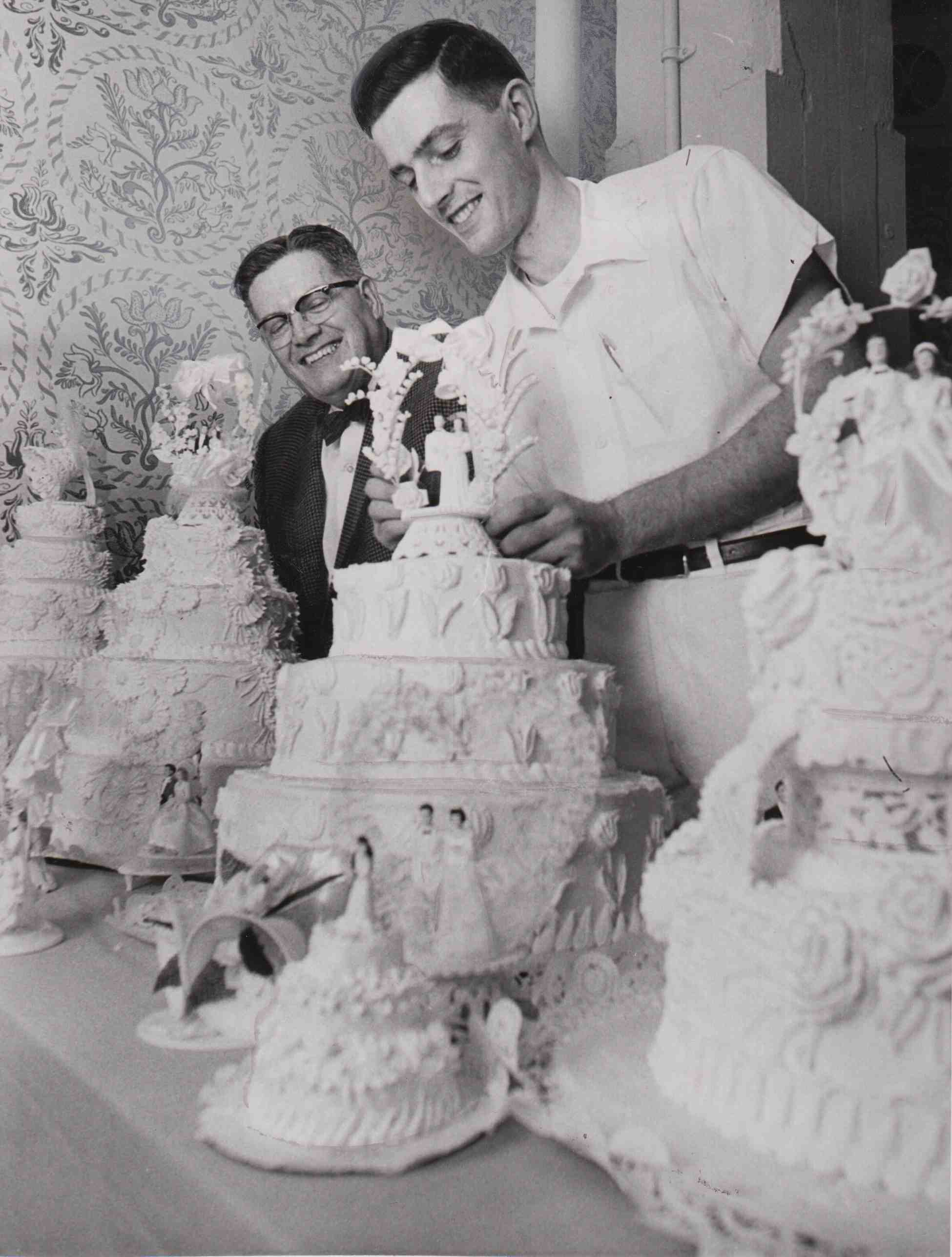 Wedding Cakes, 1953 ID: 2370 | This file appears in: Hough Bakery Arthur Pile Sr. (left) and Arthur Pile Jr. (right) admire Hough Bakeries wedding cakes in 1953. Image courtesy of Cleveland State University Library Special Collections Download Original File "Wedding Cakes, 1953" appears in: Hough Bakery