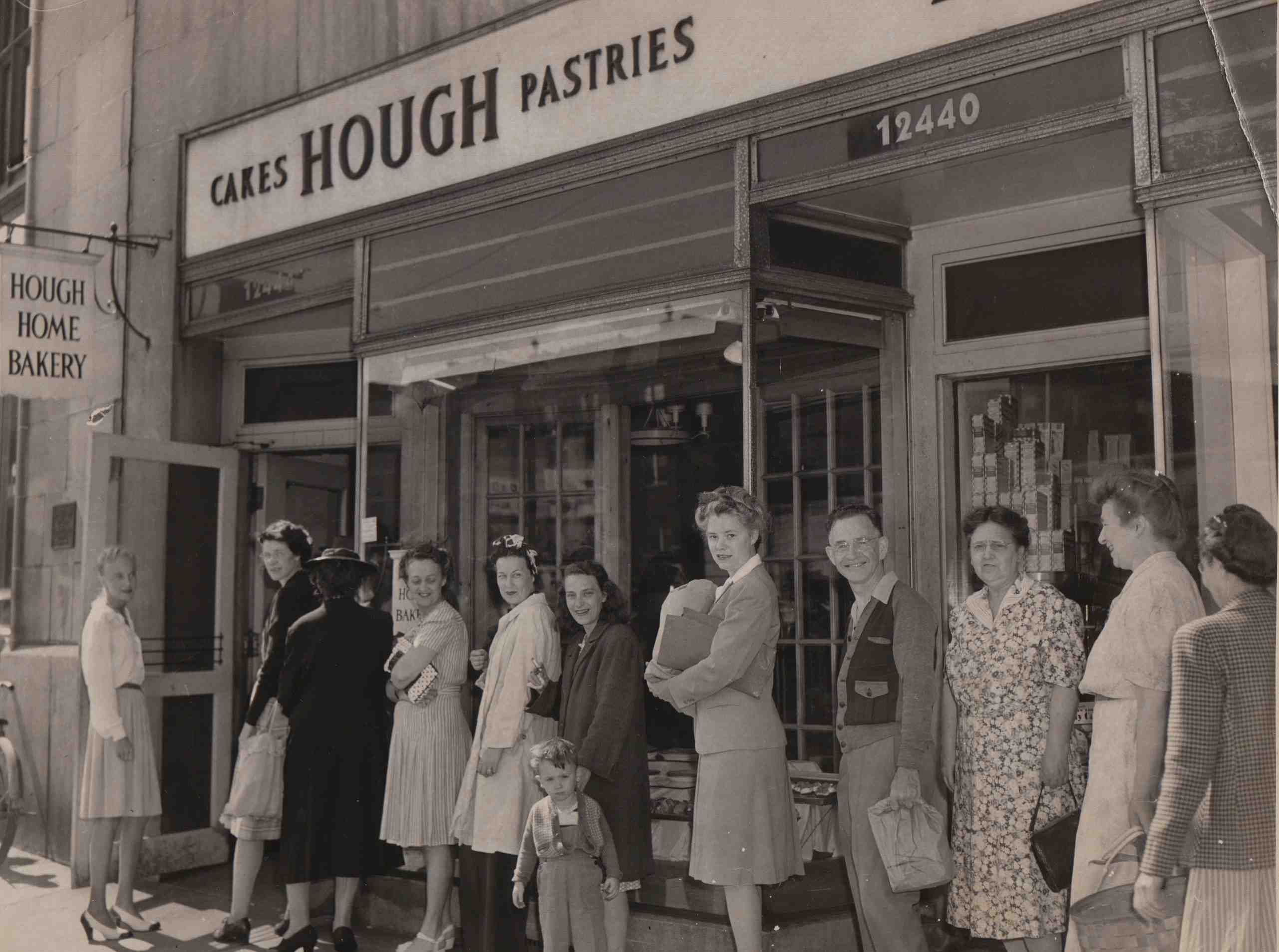 Customers form a line outside of a Hough Bakery the day after V-J (or Victory in Japan) Day, which celebrated the end of World War II in 1945. It is likely that the bakeries were closed on V-J Day, leading to the rush of shoppers looking to restock their pantries the following day.