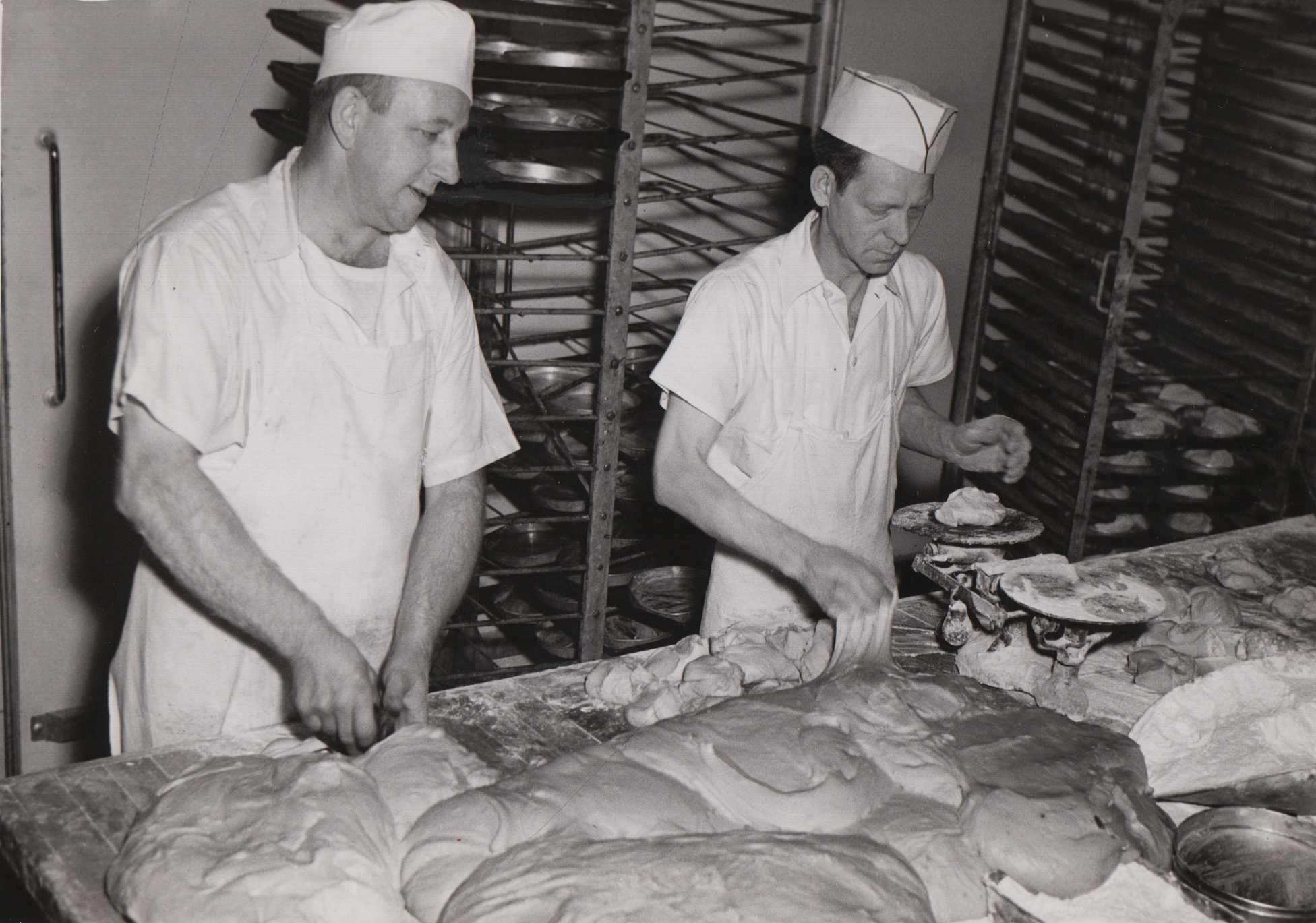 Bread Bakers, 1945 ID: 2375 | This file appears in: Hough Bakery Hough bakers knead bread dough in 1945. Image courtesy of Cleveland State University Library Special Collections Download Original File "Bread Bakers, 1945" appears in: Hough Bakery