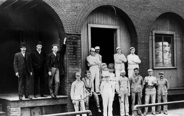Kent's early economy thrived on its many mills which were powered by the mighty Cuyahoga. Popular mills of the area included flour mills, grist mills and woolen mills. The workers in this photo pose after a hard day's work. Mill work was challenging, and it shows in the worn clothing and tired faces of these men. What does the sign say? Can you figure out what type of mill this was by reading it? | Source: Kent Historical SocietyDownload Original File