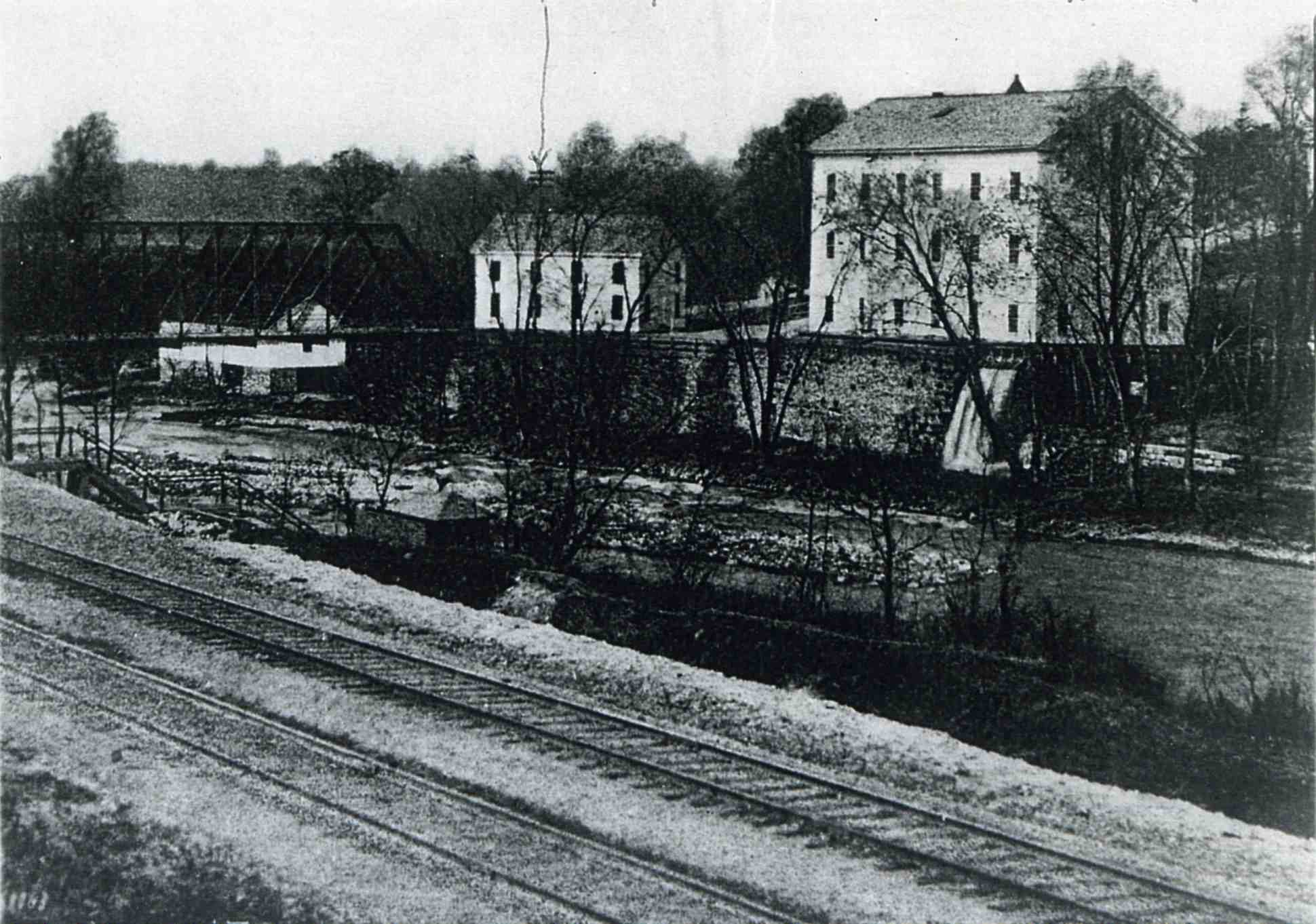 Established in 1832, the Kent Flour Mill (on the right) was once the pride of Franklin Township. It stood on the western bank of the Cuyahoga and ran until the river flooded in 1913. Standing to the left of the mill in this photograph is the town's tannery, which was operated for a time by famous abolitionist John Brown. Both these buildings have since been torn down. | Source: Kent Historical SocietyDownload Original File