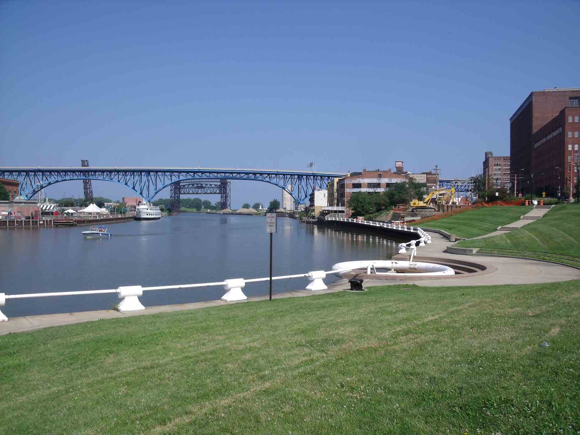 Stand at Settler's Landing today and you will find an RTA rapid station and a view of Cleveland's Flats District. In 1796, however, this was the landing site of Moses Cleaveland and his surveying team from the Connecticut Land Company. The Cuyahoga River, Iroquois for "crooked river," provided a safe harbor for ships traveling on Lake Erie, making this an attractive place to build a city. | Creator: CSU Center for Public History + Digital HumanitiesDownload Original File