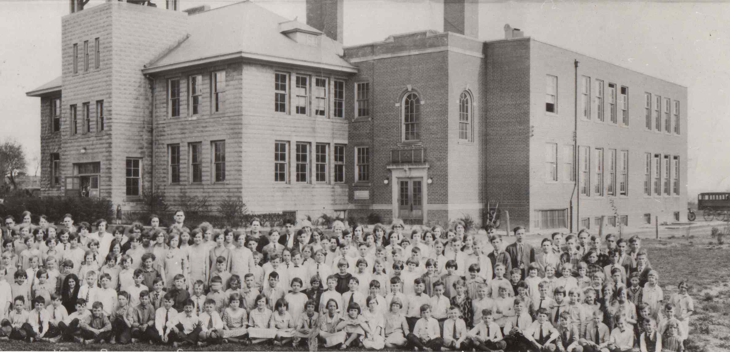 Examine this photo of the first North Royalton High School (and its expansion) on Royalton Road in 1929. What can you tell about the growth of the community since the original sandstone building was constructed? Is the building just a high school? Also, note the "school bus" to the right that some students rode: a covered "kid wagon."
