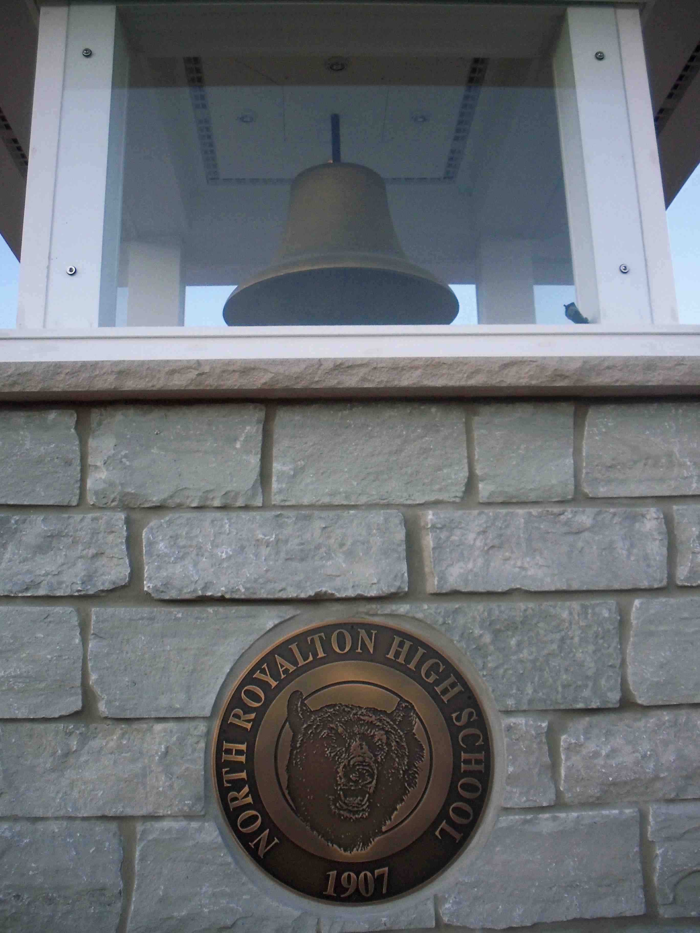 This is the original bell used at the old North Royalton High School on Royalton Road. It sat in storage for years before getting restored to commemorate the 100th anniversary of North Royalton High School in 2007. A decorative replica tower was erected near the main entrance of the current High School to house the bell.