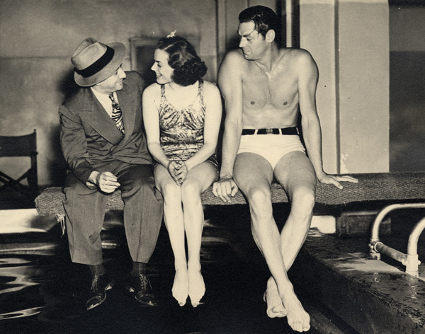 Billy Rose (left) sits with the stars of the Aquacade -- Eleanor Holm and Johnny Weissmuller. Rose and Holm were both married to other people at the time, but rumors swirled about an affair between the two. They ended up marrying in 1939. | Date: 1937 | Source: Cleveland State Library Special CollectionsDownload Original File