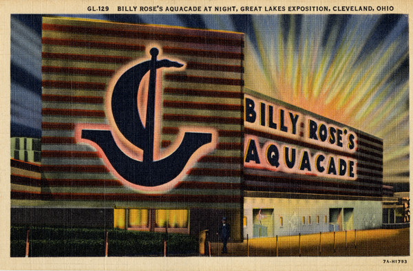 The back of this postcard reads: ""The modernistic exterior of Billy Rose's Aquacade, mammoth aquatic-musical-dancing extravaganza, is most impressive under the stars. This 5,000-seat theater-restaurant has been acclaimed the sensation of the show world, presenting a galaxy of Olympic champions." | Date: 1937 | Source: Cleveland State Library Special Collections Download Original File
