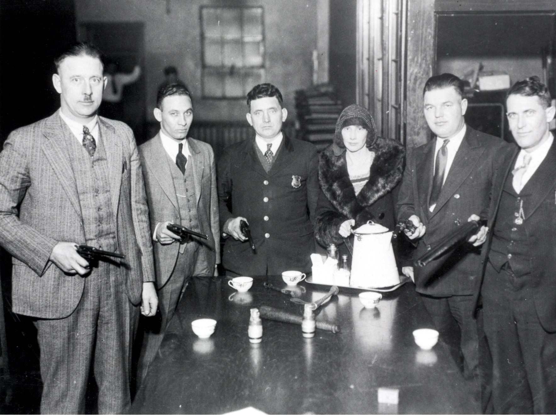Posing (left to right) are Miles Heights officials Tom Glassburner, Mark Anthony, M. T. Miklaus, Ruth Boltz, Sam Provatears, and Al W. Eidam. While guarding Miles Heights Town Hall in 1932 to prevent the suburb's annexation by Cleveland, councilwoman Ruth Boltz had hot coffee and sandwiches brought in, "So it looks like an all night session." The "siege" ended peacefully and Miles Heights eventually became a part of Cleveland. | Source: Cleveland State University Library Special CollectionsDownload Original File