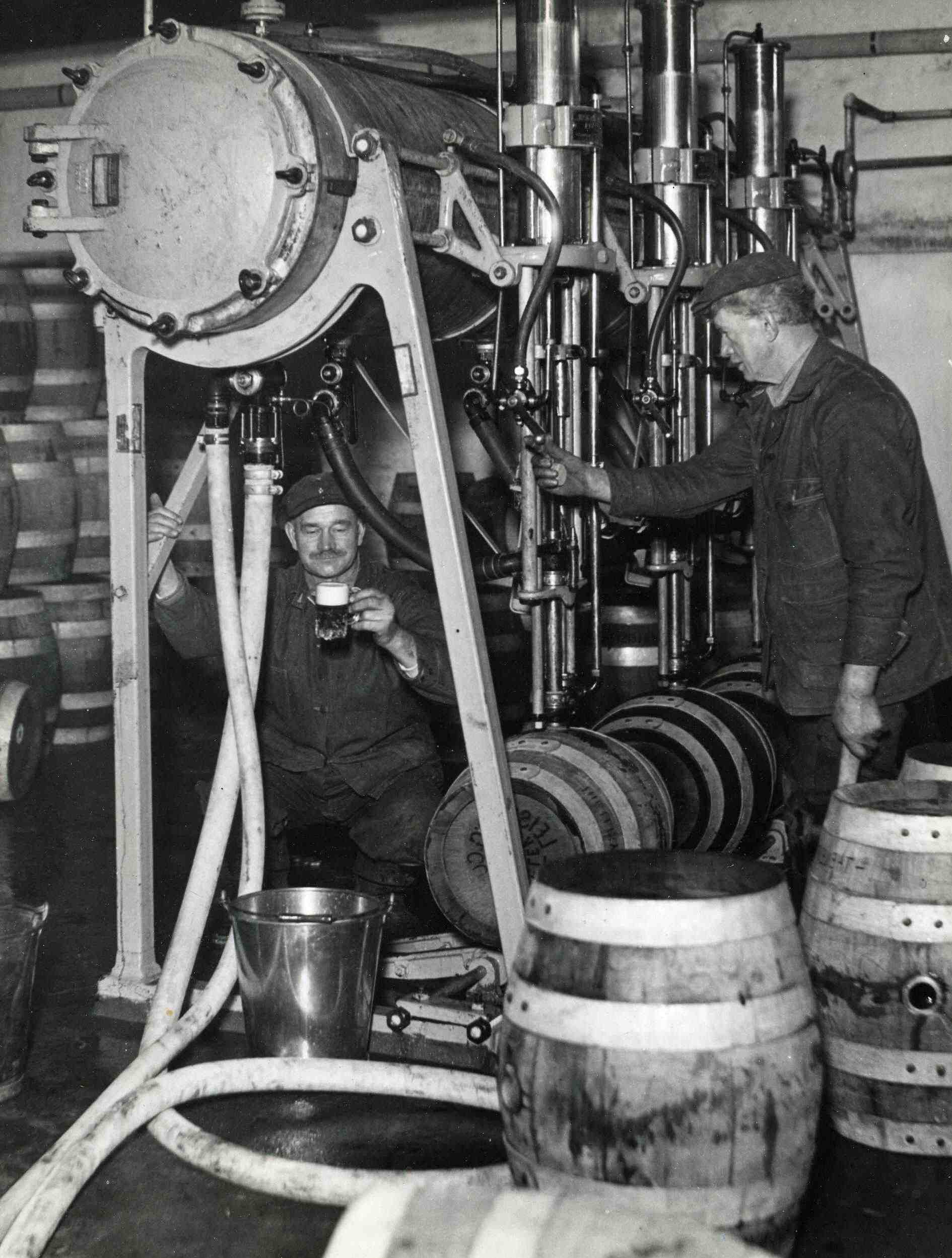 Phillip Bernair (left) and Sebastian Aigner sample the final product at the Cleveland Home Brewing Company before placing the beer in waiting kegs. The Cleveland Home Brewing Company was founded in 1907 by Ernst W. Mueller. Its brewery was located at 2501 East 61st Street, near Outhwaite Avenue. Mueller, a German immigrant, had previously owned the Cleveland Brewing Company, which merged with the Cleveland & Sandusky Brewing Company in 1897. The Cleveland Home Brewing Company was perhaps best known for its "Black Forest Beer" based on the Mueller Family's own formula. Sales declined at the company following World War II, however, and it closed in 1952. | Date: 1934 | Source: Cleveland State University Library Special CollectionsDownload Original File