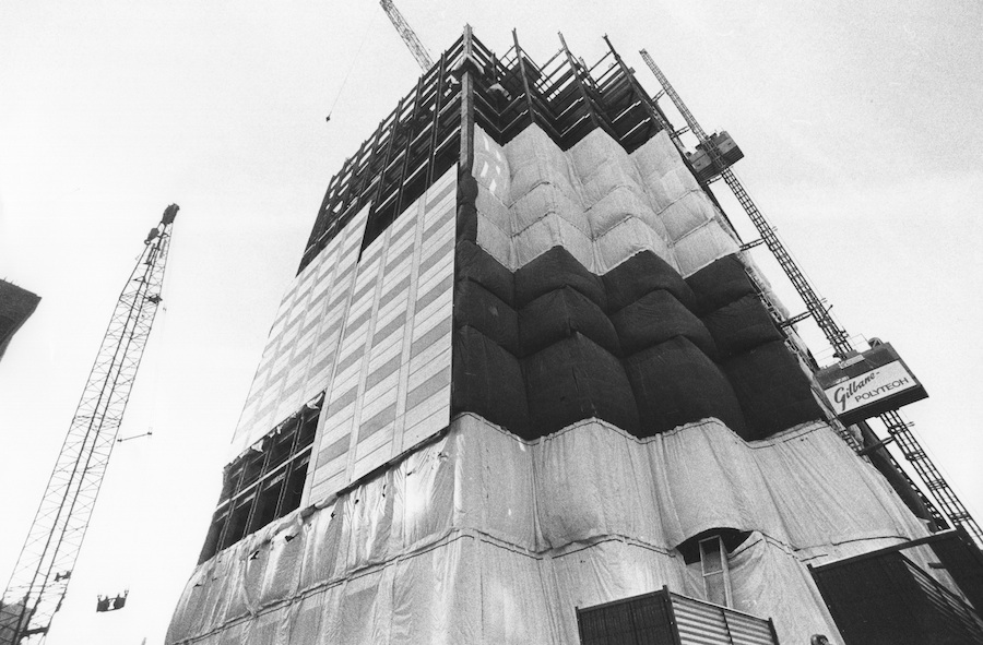 To provide stability for the 20,000 tons of structural steel needed to complete the Sohio Building, shafts for concrete were drilled 240 feet below the surface to lay the foundation. | Date: 1984 | Source: Cleveland Public Library, Photograph CollectionDownload Original File