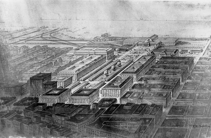 This illustration from 1903 shows an early conception of the Cleveland Group Plan. At this point, the plan included the construction of the city's central train station at the northern end of the Mall. The station is included in this illustration but was never built. Instead, the Van Sweringens constructed Cleveland's Union Terminal on Public Square. | Date: 1903 | Source: Western Reserve Historical SocietyDownload Original File