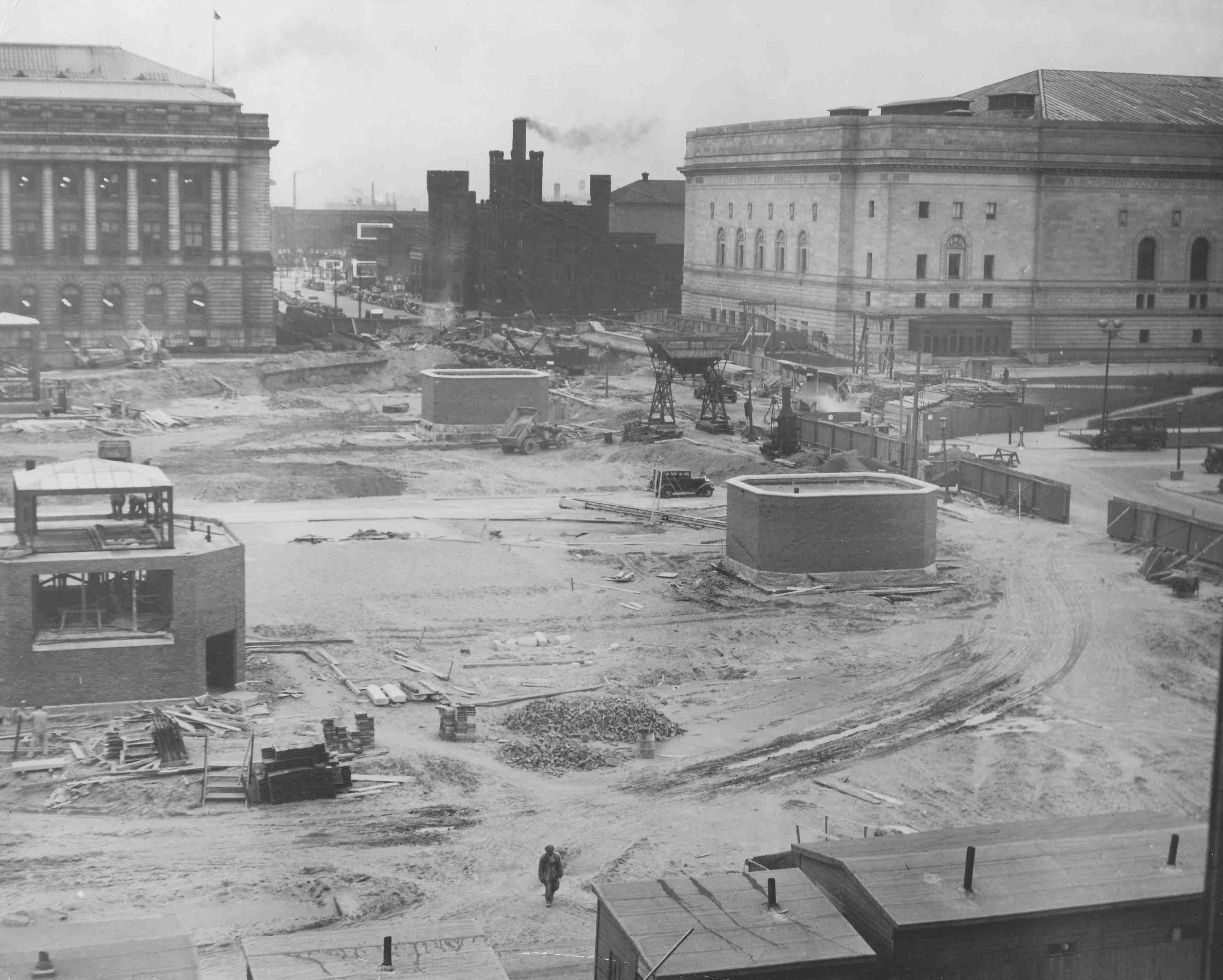 The Mall has been dug up several times for underground construction. Here, in 1932, a convention center is being built underneath a part of the Mall. In 2011, this section of the Mall was again excavated as a new underground convention center (replacing the original one, which had been extensively renovated in the 1960s) was set to open in conjunction with the Center for Health Innovation at the corner of Ontario Street and St. Clair Avenue. | Date: 1932 | Source: Cleveland Memory Project, Cleveland State University Library Special Collections Download Original File