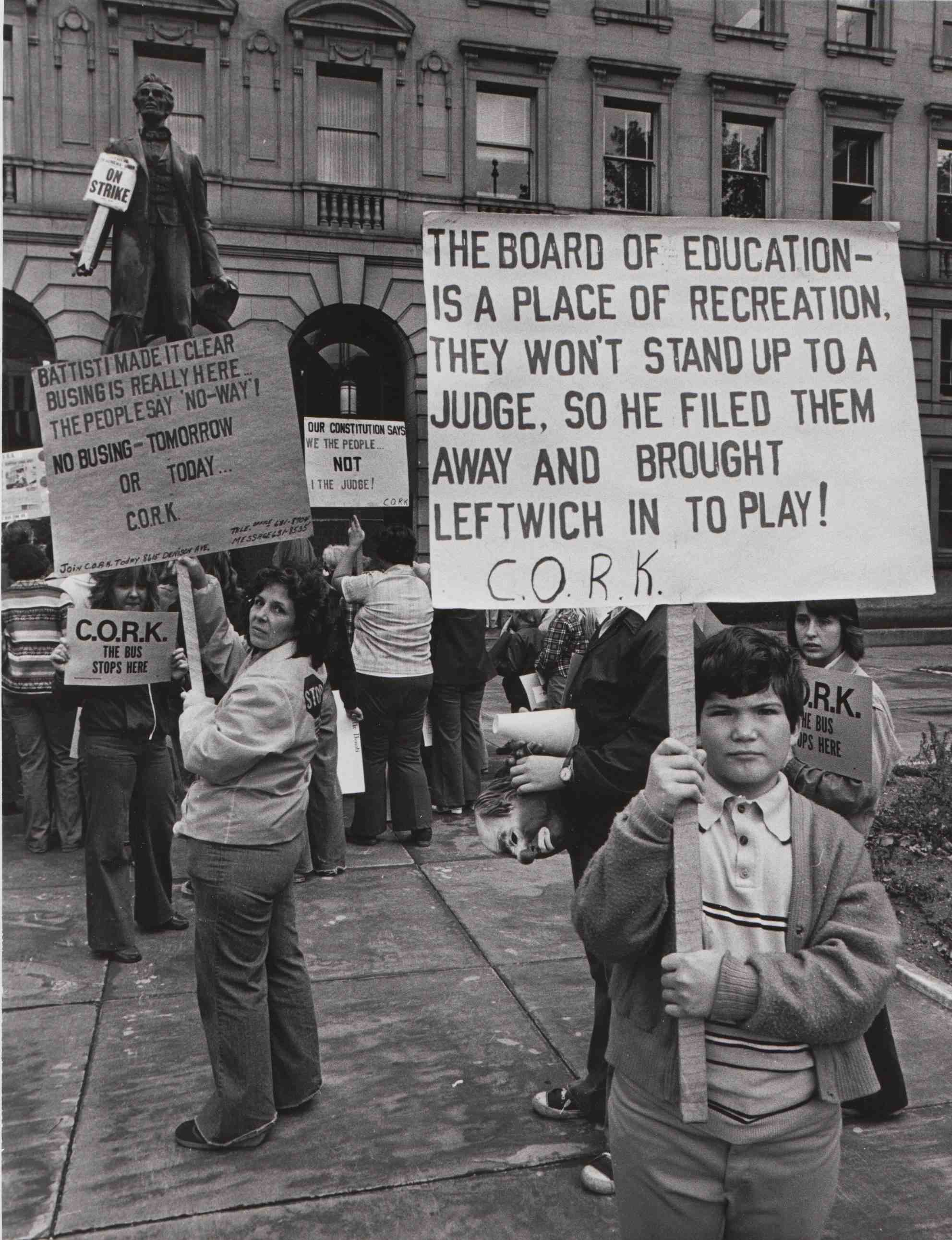 Since it is surrounded by government buildings, the Mall has been the site of a number of political protests. In this 1978 photograph, a protest at the Board of Education building (centered on the Abraham Lincoln statue) spills out onto the Mall. The crowd is protesting the decision by federal judge Frank J. Battisti in Reed v. Rhodes that paved the way for cross-city busing intended to racially integrate Cleveland's schools. | Date: 1978 | Source: Cleveland Memory Project, Cleveland State University Library Special Collections Download Original File