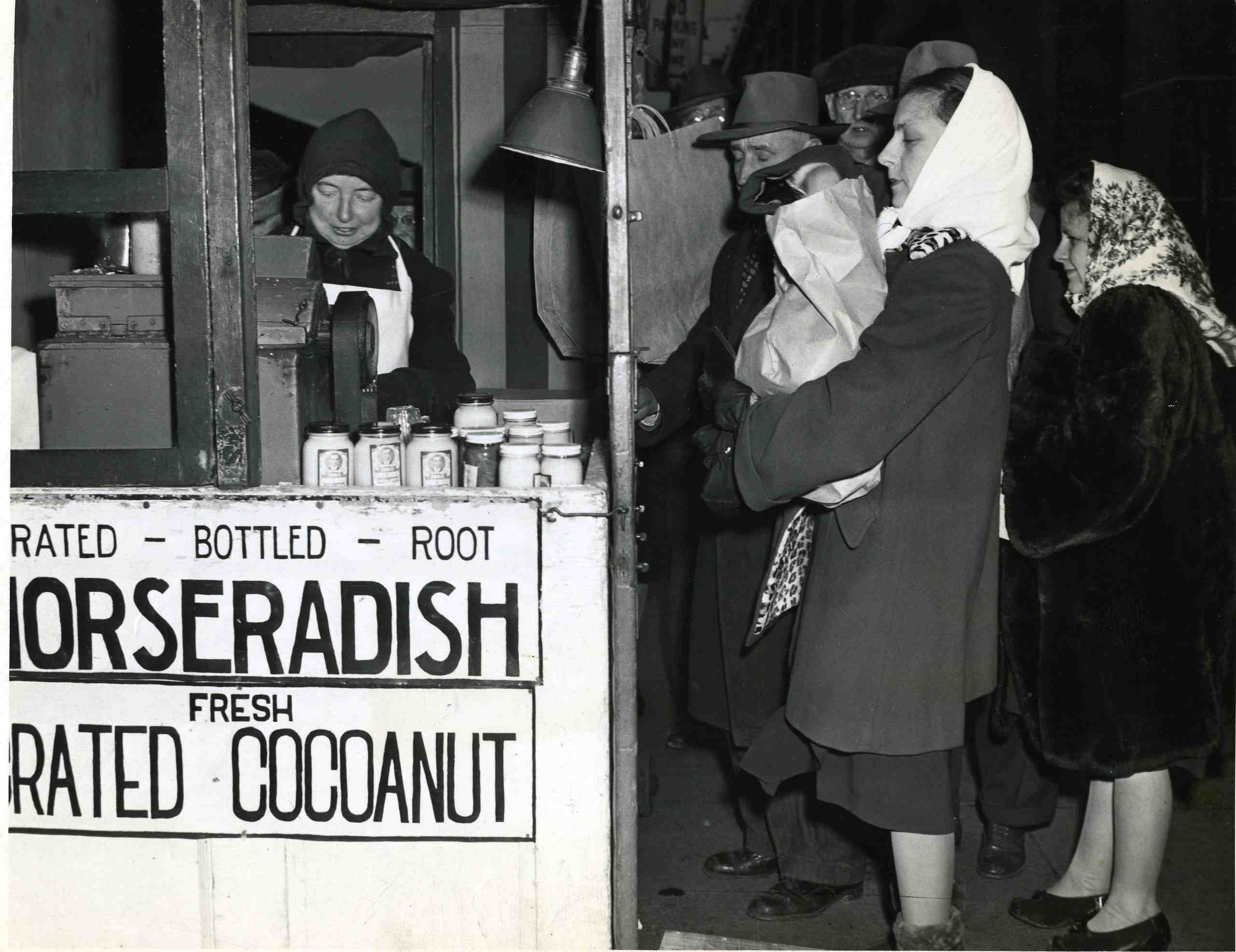 Myrtle Chaffill sells horseradish and ground coconut at the West Side Market in 1947. While Chaffill appears to be set up outside, temperatures were frigid even within the produce arcade during the winter, forcing vendors and customers to bundle up. The arcade was not fully enclosed until 2001, at which point central heating was also added.