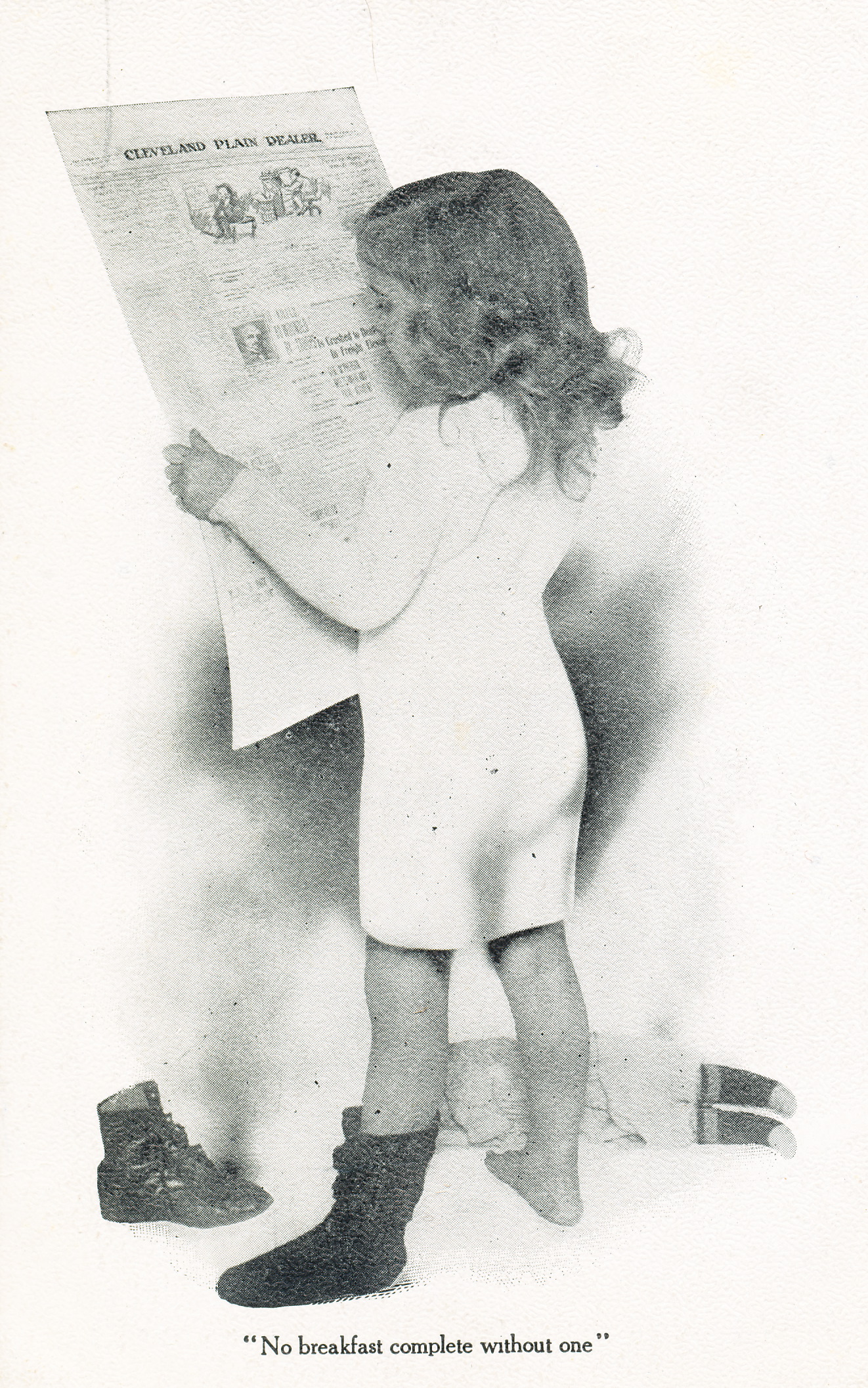 "No breakfast complete without one" ID: 2694 | This file appears in: Cleveland Plain Dealer This postcard, ca. 1910, is advertising the Cleveland Plain Dealer. It shows a little girl in her pajamas reading the newspaper. Image courtesy of the J. Mark Souther Postcard Collection Download Original File ""No breakfast complete without one"" appears in: Cleveland Plain Dealer
