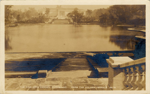 The Fine Arts Garden of the Cleveland Museum of Art is visible in this view from the Holden Terrace, named in honor of Liberty Holden. Holden, president of Cleveland's building committee, played a role in the construction of the museum. | Source: Cleveland State University, Michael Schwartz Library, Special CollectionsDownload Original File