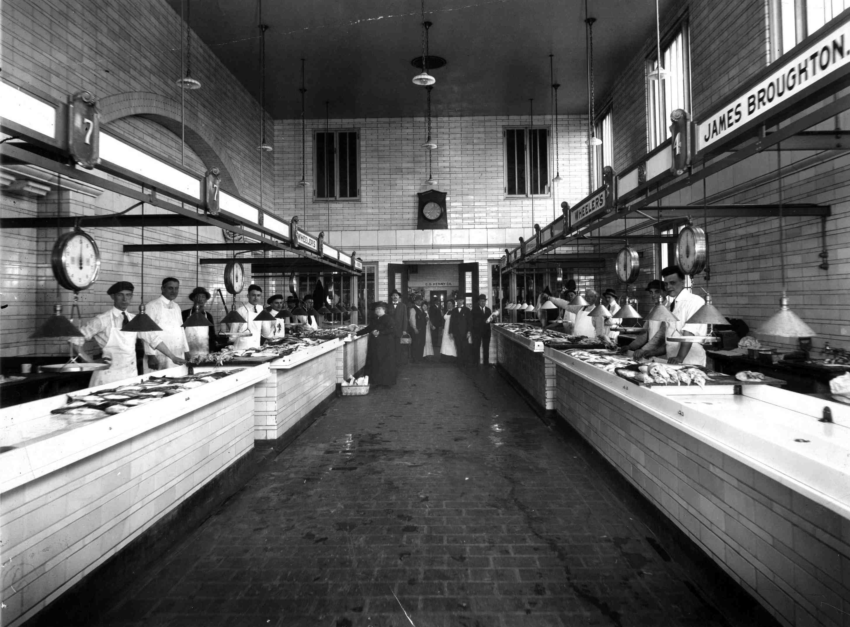 Since the West Side Market opened in 1912, its fish stalls have been located in a separate room in the market's northeast corner. | Source: Cleveland State University, Michael Schwartz Library, Special CollectionsDownload Original File