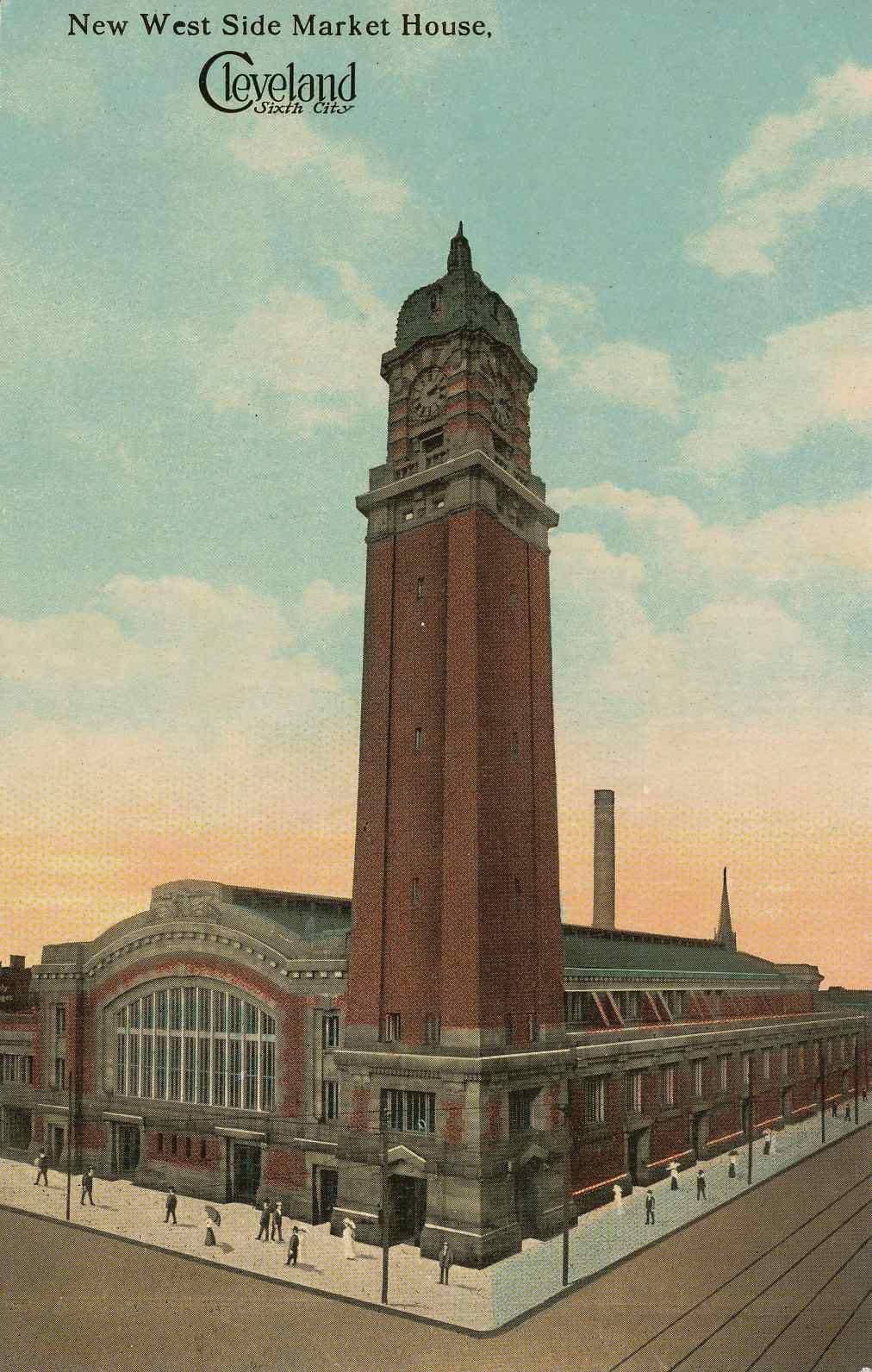 The tower formerly held a large water reservoir used to periodically flush out the stalls. It also served as a safety mechanism in case of fire. The metal tank was removed and sold for scrap during World War II. | Source: J. Mark Souther Postcard Collection