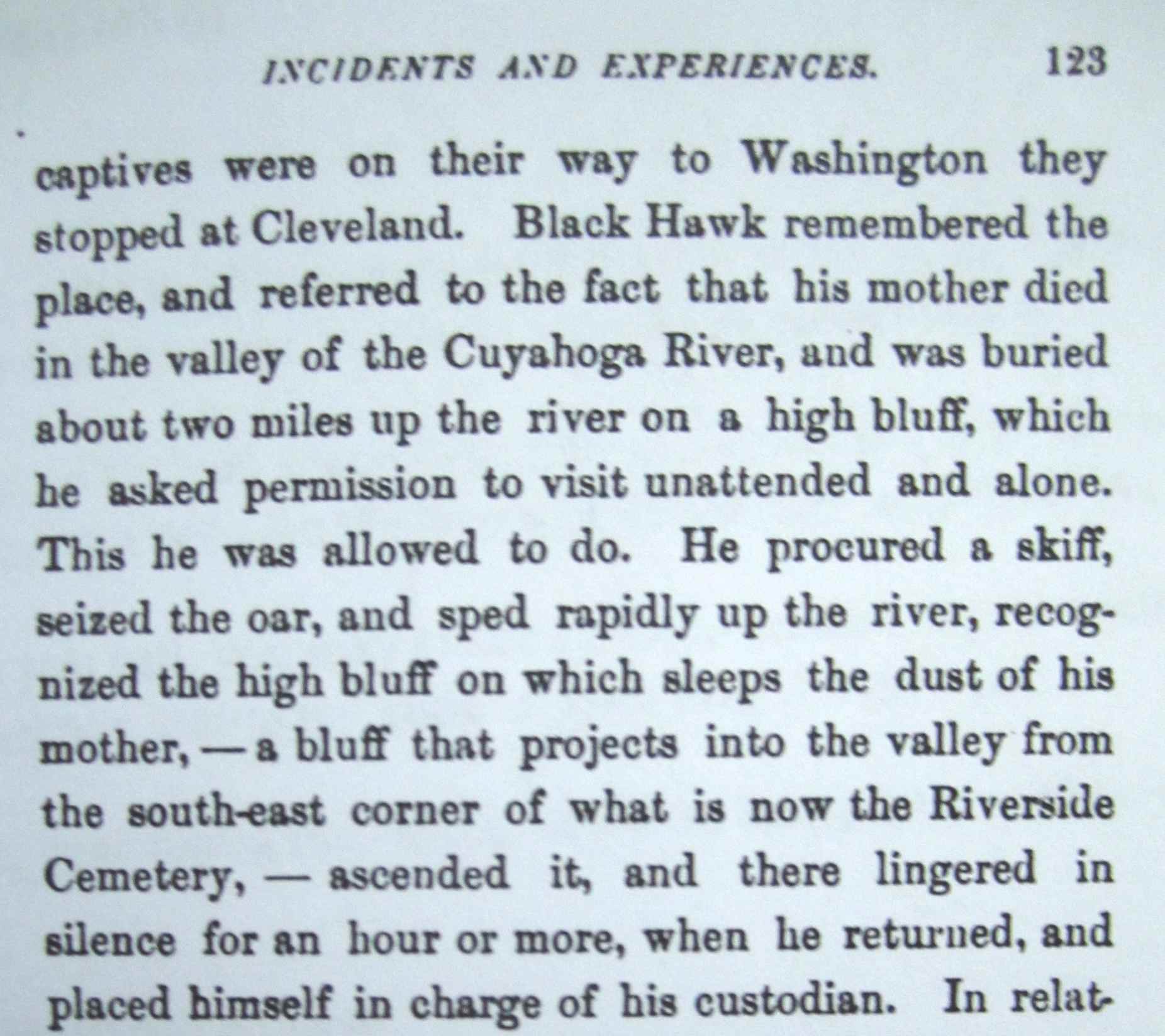 This excerpt from page 123 of Harvey Rice's "Pioneers of the Western Reserve" (Boston and New York: Lee and Shephard Publisher, 1883) reveals the details of the new version of Black Hawk's trip to Cleveland in 1833 that circulated in the city in the post-Civil War period. It featured an alleged canoe trip by Black Hawk up the Cuyahoga River to visit the grave of his mother on the grounds of Riverside Cemetery. | Date: 1883 | Source: Cleveland State University Library Special CollectionsDownload Original File
