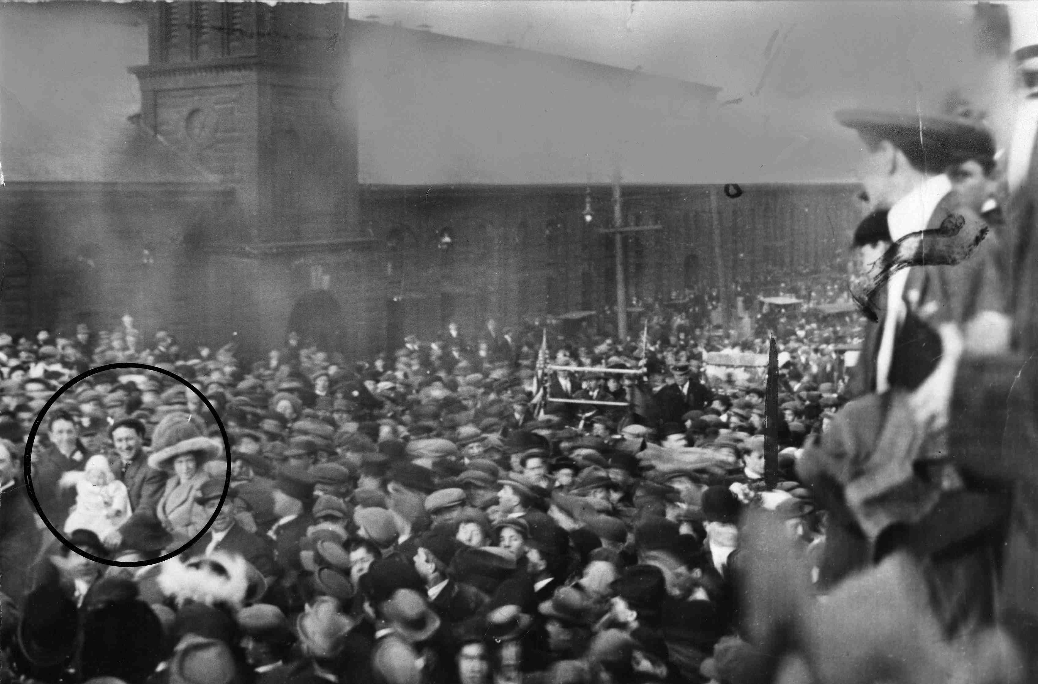 Johnny Kilbane, his wife Irene, his baby daughter Mary, and Johnny's manager, Jimmy Dunn (shown in circle), leave Union Station in a car at 4 PM on March 17, 1912 at the head of one of the largest and longest St. Patrick's Day parades in the history of Cleveland. | Date: 17 March 1912 | Source: Cleveland State University Library Special CollectionsDownload Original File
