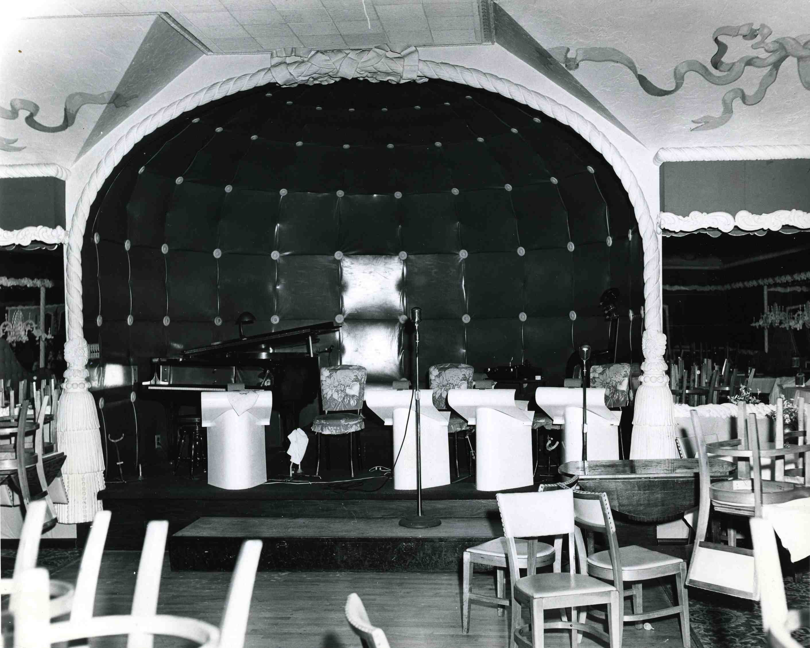 The stage in the main room of the Mounds Club featured some of Cleveland's best entertainment in the 1930s and 1940s. Thomas McGinty, who built the Mounds Club, sold his interest in the club in the late 1940s and opened up a new club in Las Vegas--the Desert Inn. | Date: ca. 1940s | Source: Cleveland State University Library Special CollectionsDownload Original File