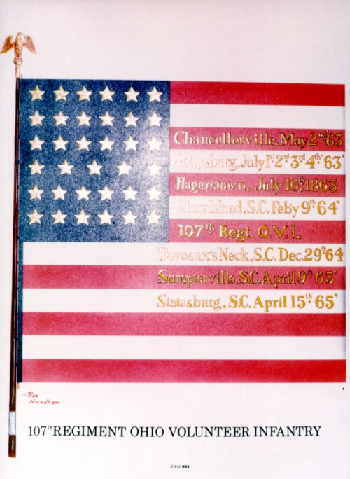 The 107th OVI was one of the many regiments organized at Camp Taylor. A large part of the regiment was German immigrants, causing the group to also be known as the 5th German Regiment. On September 9, 1862 it was mustered into a three year service. The 107th participated in the battle of Chancellorsville in May, 1863 ,Gettysburg in July of 1863, helped pursue Lee as he crossed the Potomac, Hagerstown in July of 1863, John's Island in July of 1862, and others. On July 10, 1865 the 107th was mustered out of service and returned to Cuyahoga county to receive their payment at Camp Cleveland.