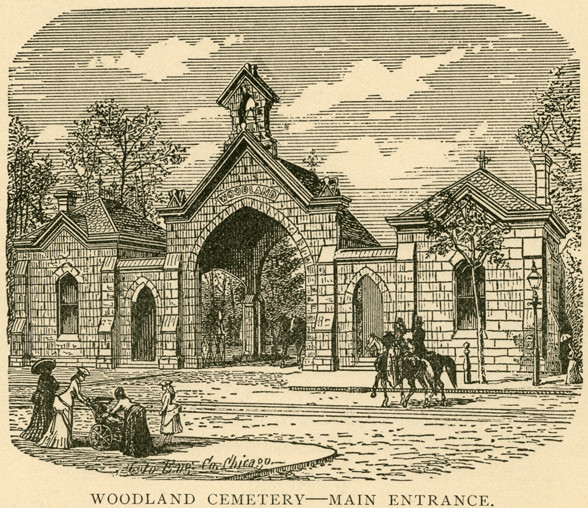 In 1870, a stone entrance-way with a chapel and a waiting room was constructed. In 1995, citing safety concerns and financial constraints, the city dismantled the stone gate. For the next two decades the stones lay in a pile in the cemetery until Michelle Day led a successful campaign by the Woodland Cemetery Foundation to rebuild the historic structure. Work was completed in 2020. | Source: Cleveland Memory Project, Cleveland State University Library Special CollectionsDownload Original File