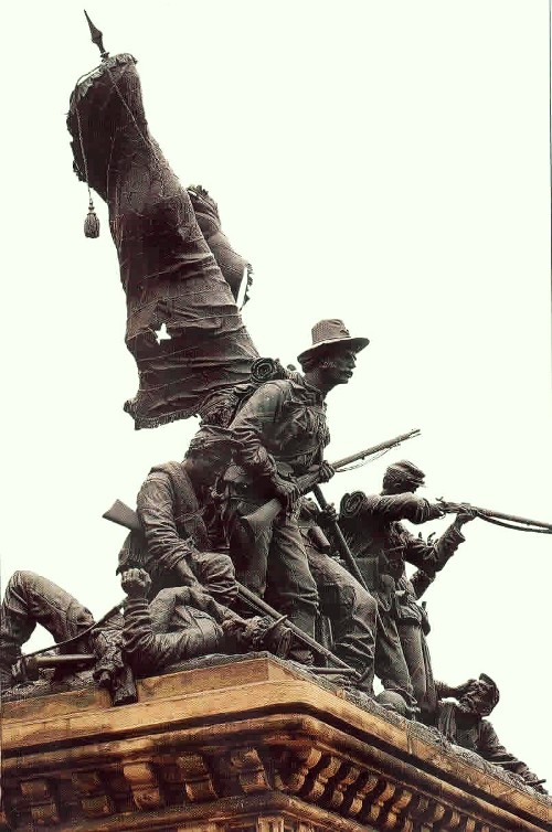 "The Color Guard" is a representation of the Infantry group. Depicted here is the One Hundred and Third Ohio infantry at the Battle of Resaca that took place May 13-15, 1864. Sergeant Martin Striebler and his eight corporals defended the flag until each of them were killed or wounded. The monument's architect, Levi T. Scofield was one of the infantrymen who fought at this battle. | Creator: C. W. PerronDownload Original File