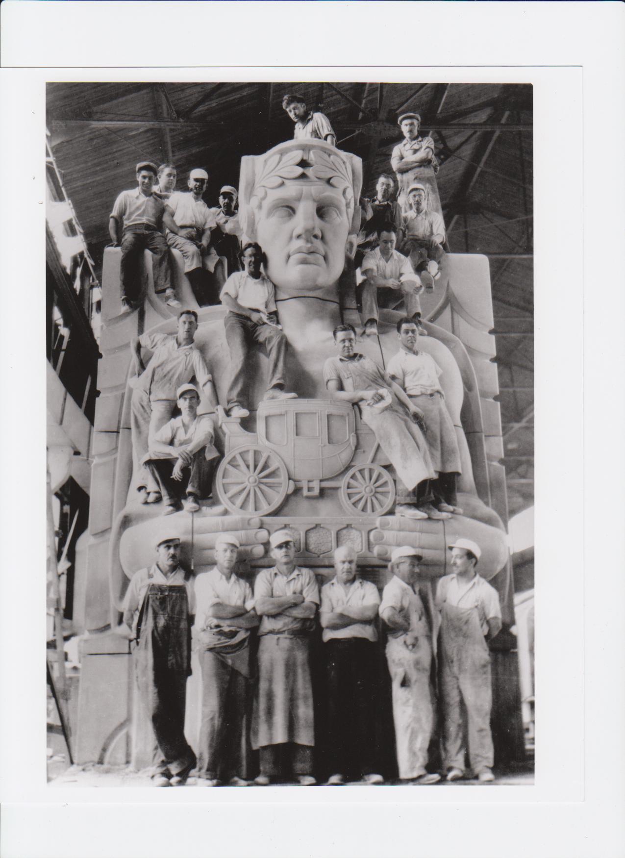 Stone carvers sitting atop one of four "Guardians of Traffic," which were transportation-themed Art Deco pylons crafted to crown the supports of the Lorain-Carnegie Bridge in 1932. After extensive upgrades to its roadway in the early 1980s, the bridge reopened as Hope Memorial Bridge in tribute to the family of Cleveland-born entertainer Bob Hope, many of whom were stonemasons.