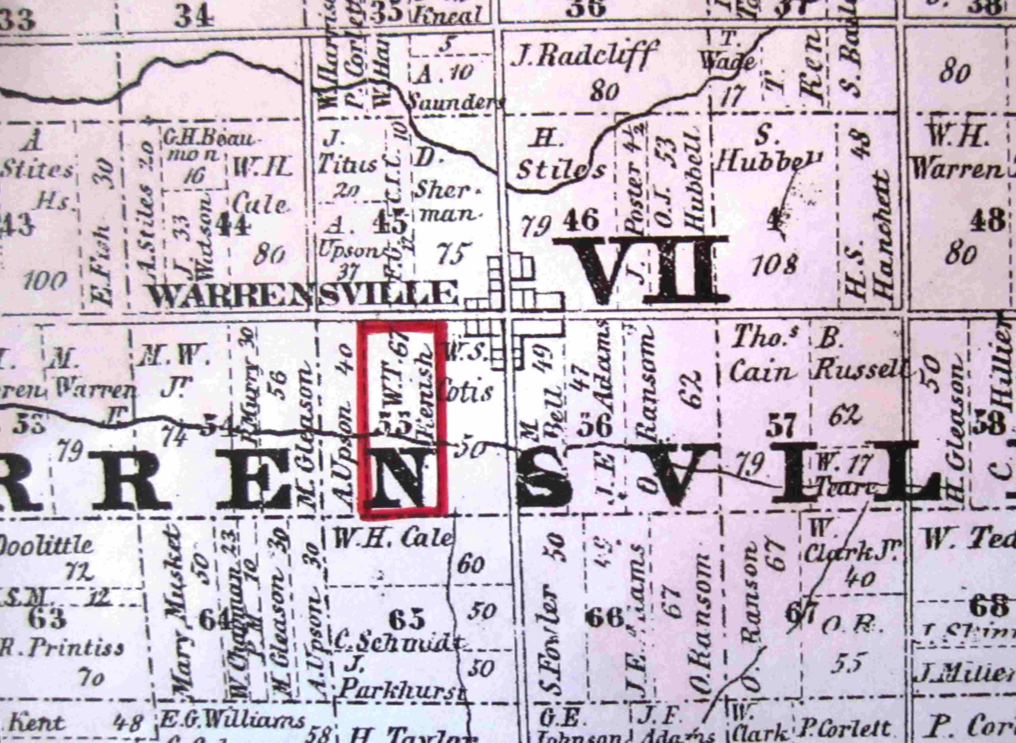 This map of Warrensville Township is part of the 1852 Blackmore Cuyahoga County Map. The original 67-acre farm purchased by William Kewish in 1844 is outlined in red. In 1857, several years after this map was published, William's widow Jane and William Cain, either a brother or other close relation to Jane, expanded the size of the farm by purchasing 50 acres of land owned by William C. Otis immediately to the east (to the viewer's right on the map) of the original farm.