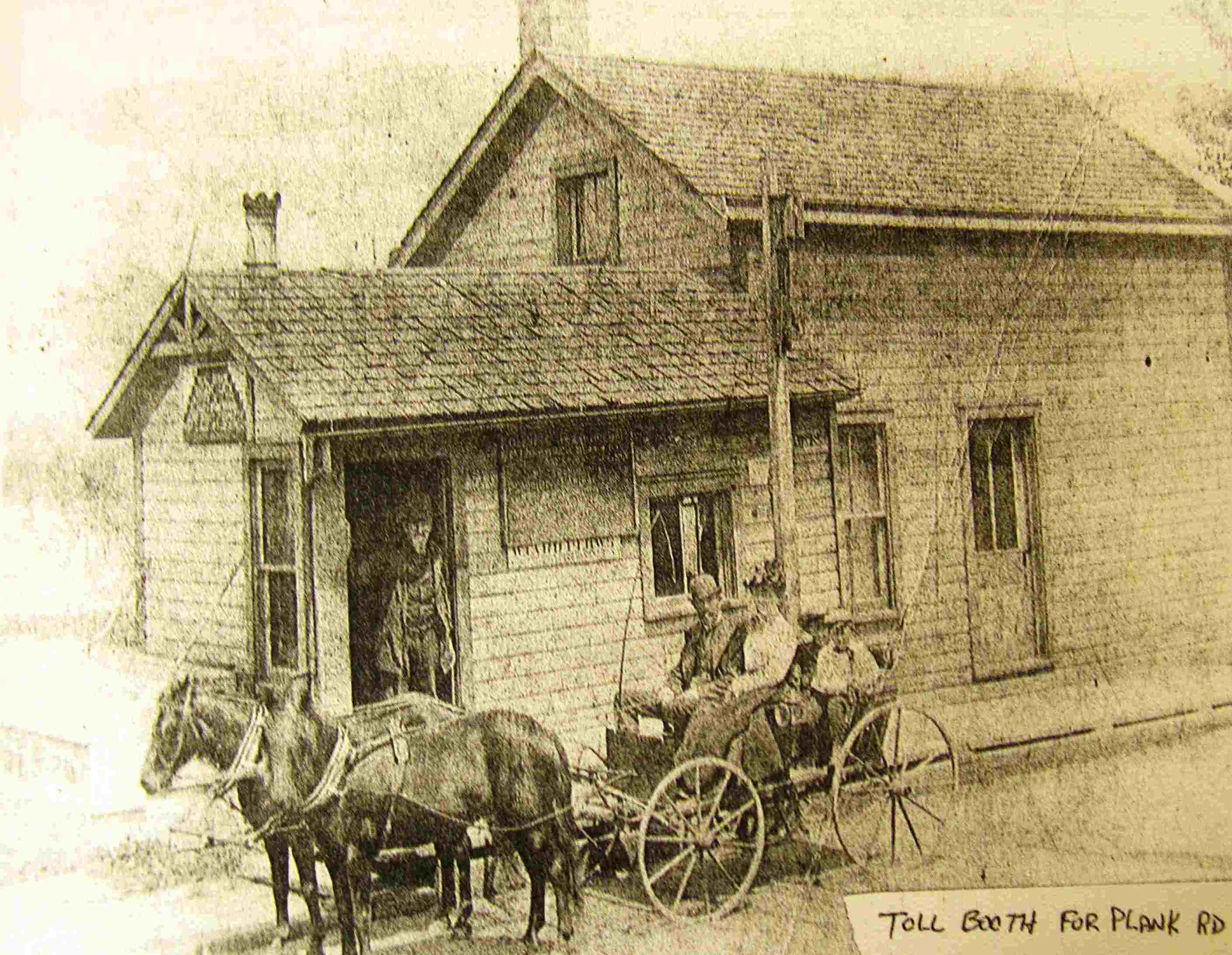 This undated nineteenth century photograph shows a couple in a buggy pulling up to the toll station on the Euclid Plank Road. The man standing in the doorway would have collected the toll from the couple. This photograph is representative of nineteenth century toll stations and plank roads in Oho.