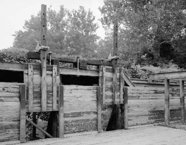 This 1913 photo shows the wood-lined trough and waste gates open after the canal has been drained. To prevent too much water from accumulating, waste gates allowed surplus water to escape the canal. | Date: 1913 | Source: Library of Congress, Historic American Buildings Survey, Historic American Engineering RecordDownload Original File