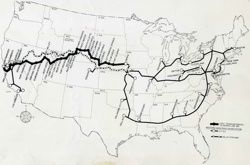 This map shows some early routes and the first cross country telegraph line of Wade's Western Union Telegraph Company. By 1867, Jeptha Wade was the virtual creator and chief ruler of the greatest and most prosperous telegraph enterprise in the world.