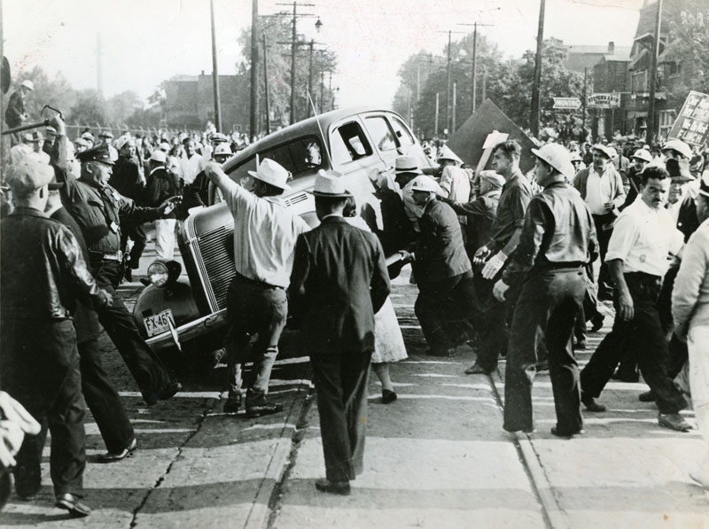 Although the Fisher Body strikes were generally nonviolent in Collinwood, there were some tense moments, such as the one shown here during a later strike in 1939. Another incident occurred on the first night of the Fisher Body strike on December 28, 1936. Picketers blocked the departure of a train that was meant to transport the car bodies manufactured by the plant earlier that day. Eight Cleveland police were sent to try and break up the picketers, but the strike supporters remained for three hours. | Source: Cleveland Memory Project, Cleveland State University Library Special CollectionsDownload Original File