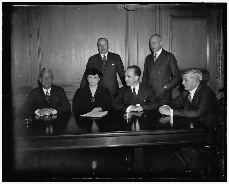 When the Fisher Body strike first began, President of General Motors, Alfred P. Sloan, Jr. "refused to attend any conferences until strikers left all their plants." With pressure from President Roosevelt to quickly resolve the strike, Sloan changed his mind. On January 21, Sloan (on the far left) met with the Secretary of Labor and the Michigan Governor to negotiate the strike's ending. | Source: Library of Congress, Prints and Photographs Division, Harris & Ewing Collection, HABS OHIO,LC-H22- D-635 [P&P]Download Original File