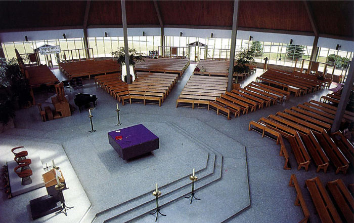 Fan-shaped seating with surrounding reflective windows focus attention upon the congregation. A change in theme and focus resulting from the Second Vatican Council in the early 1960s inspired the church design. | Source: Richard Fleischman + Partners, Architects, Inc.Download Original File