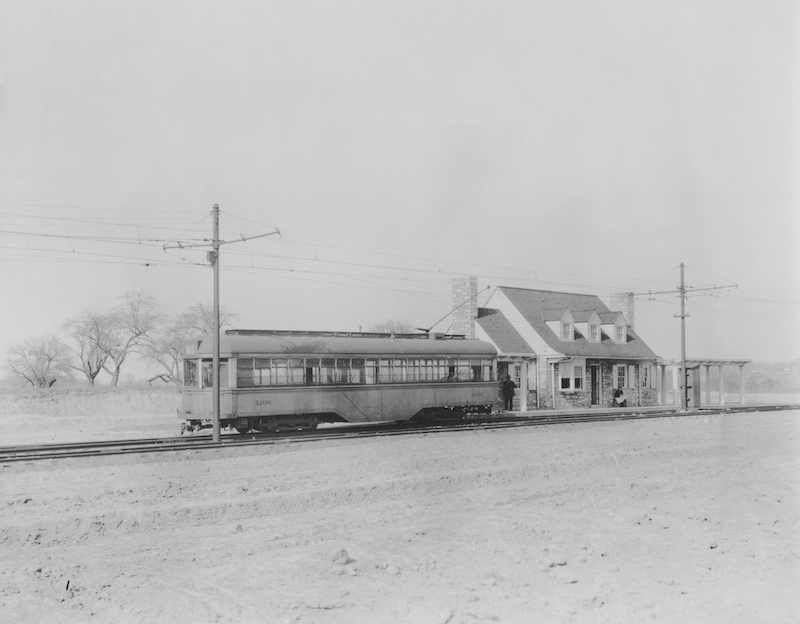 In 1923, a shelter with living quarters on the upper floor was constructed at the Lynnfield station. The structure housed a waiting room, as well as tobacco and newspaper stands. Designed by local architect James A. Reese, the station was modeled on a Pacific Electric transit station prototype. Despite the relatively desolate surroundings at the time of its construction, the exterior was designed in order to meld with the intended residential character of the area. The stone and wood-shingled building was built at a cost of nearly $18,000. | Source: Shaker Heights Public LibraryDownload Original File