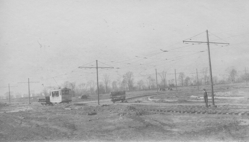 A trolley connected Shaker with Cleveland Heights while construction of the Cleveland Interurban Railroad was being completed. Pictured above is the installation of the temporary line, looking Northwest at the corner of Shaker Boulevard and Coventry. | Source: Shaker Historical Society Download Original File