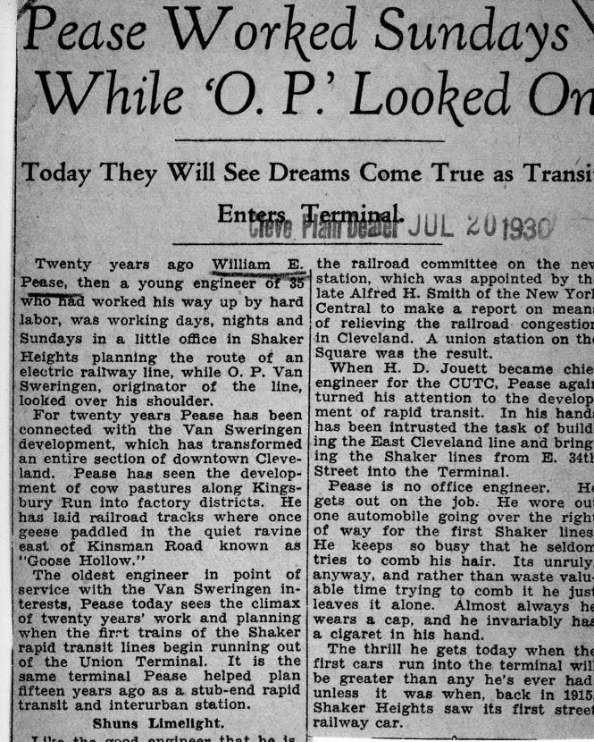 This July 20, 1930 Cleveland Press article chronicles the work ethic of W. E. Pease, chief engineer for the Van Sweringens, in early twentieth century Cleveland. | Source: Cleveland State University Library Special CollectionsDownload Original File