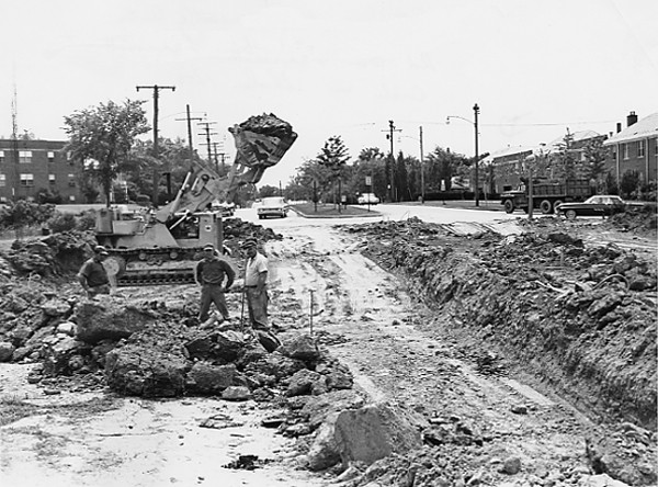 In 1964, the Van Sweringens' design of Fairmount Circle was significantly changed when Warrensville Center Road was extended through the Circle to enable northbound and southbound traffic to entirely avoid driving around the Circle. | Source: Cleveland Memory Project, Cleveland State University Library Special CollectionsDownload Original File