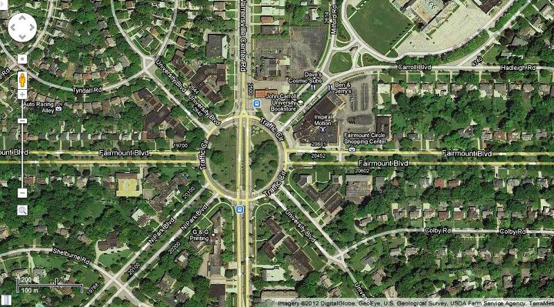 Aerial view of Fairmount Circle as it appears today. A portion of John Carrol University campus can be seen in the upper right part of the photograph, and a portion of the University School campus in the lower right. Note that Warrensville Center Road now extends through the Circle. | Source: Google MapsDownload Original File