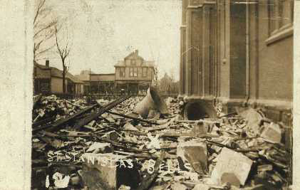 The debris from storm damage lies next to the church building including one of the bells from the towers. The storm resulted in seven deaths and significant damage to several buildings in the neighborhood. | Source: Cleveland Memory Project, Cleveland State University Library Special CollectionsDownload Original File
