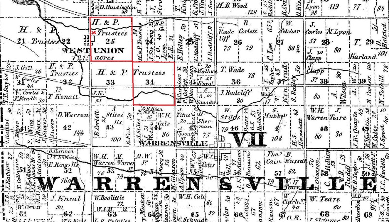 Lot 23 and 34 (outlined in red) of Warrensville Township constituted the primary farmlands of the Jacob Russell family. In 1813, Jacob Russell purchased these township lots from Lemuel Storrs. During the period 1815-1821, which ended with his death, Jacob Russell conveyed all of these lands to his sons Elisha, Ralph and Ebenezer, and his son-in-law David Benjamin. By 1852, the year in which the above map was created, all of these lands had been transferred to the trustees for the North Union Shaker Colony. The small red "x" denoted on Lot 23 is the approximate location of Jacob Russell's grave. | Source: Shaker Historical SocietyDownload Original File