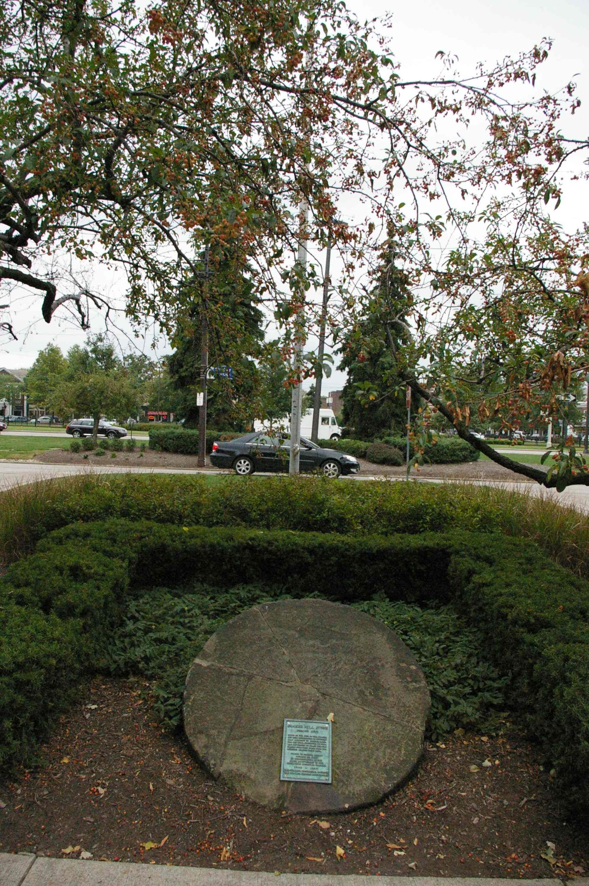 This mill stone was originally used at the Shakers' 50-foot high grist mill in Doan Brook Gorge. A grist mill turns grain into flour and corn into meal. Farmers from around the area would pay the Shakers to have their crops milled at their grist mill. The Shaker Historical Society and the Shaker Square Association placed the stone at Shaker Square in 1947 to commemorate the 125th anniversary of the North Union Shakers. In 1886, the mill stone was taken to the saw mill just west of Lower Shaker Lake. The saw mill had just been destroyed by fire, so the Shakers built a new grist mill at the site using this stone. In 1889, however, the North Union Shaker Community, then numbering only in the twenties, disbanded, and the mill fell into disuse. The 50-foot high grist mill in Doan Brook Gorge was blown up on July 4, 1886, as part of an Independence Day celebration. A local newspaper reported that "The old Shaker Mill went up in a blaze of glory" as 4,000 spectators looked on. | Creator: Christopher Busta-PeckDownload Original File
