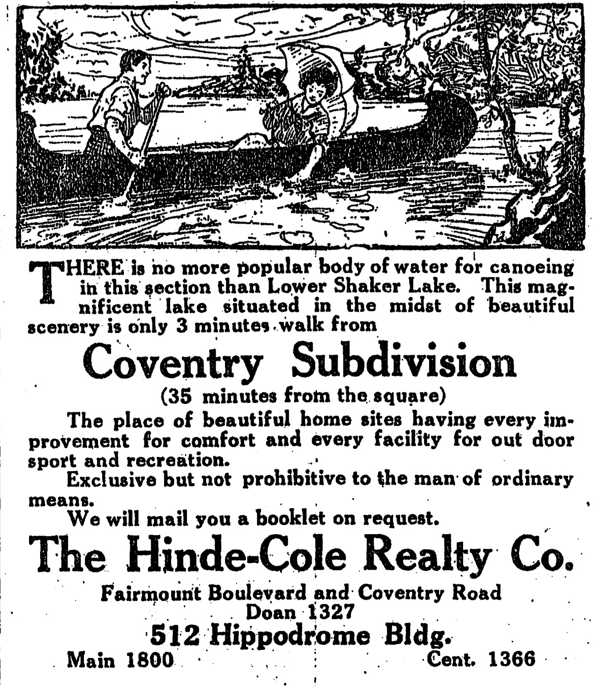 This advertisement appeared in the Cleveland Plain Dealer in 1911. It offers home sites for sale in the Coventry Subdivision of Cleveland Heights. Real estate developers often highlighted the suburbs' natural beauty, appealing to wealthy Cleveland residents fed up with the smoke and tumult of the big city. Suburban commuters wanted to get to their jobs Downtown quickly, however, which is why this ad mentions that the subdivision is "35 minutes from [Public] Square" via streetcar. The Van Sweringens' rapid transit line, which began running in 1922, shortened the time of this commute even further. | Source: Cleveland State University Library Special CollectionsDownload Original File