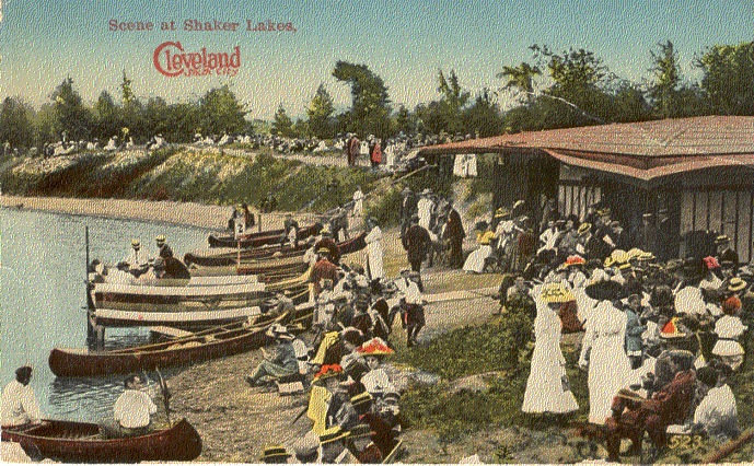 The original Shaker Lakes Canoe Club boathouse, pictured in this postcard, was built in 1907 on the southeast shore of Lower Shaker Lake. The highlight of the club's year was its annual regatta, a tradition that began in 1908. Thousands of people would attend these summertime festivals which featured canoe races, canoe tilting (similar to medieval jousting, but with canoes in place of horses), and moonlit water parades of Japanese lantern-lit canoes. | Source: Cleveland Heights Historical SocietyDownload Original File
